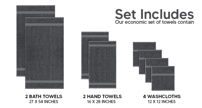 SET OF 8- Our economic set of towels contain: 2 bath towels measuring 27 x 54 inches each; 2 hand towels of 16 by 28 inches each; and 4 washcloths of 12 inch by 12 inches each Enjoy a spa like experience with our luxuriously soft and absorbent towel set.